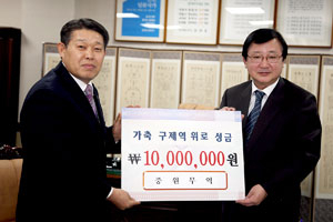 대구 중원무역㈜ 김진환 대표이사는 29일 안동시청 구제역 상황실을 찾아 구제역으로 수고하는 사람들을 위해 써 달라며 격려금 1천만원을 권영세 안동시장에게 기탁했다.