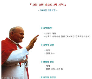 오는 5월 1일 복자품에 오를 고 교황 요한 바오로 2세를 기념하는 특집 페이지가 한국 천주교 주교회의 사이트에 개설됐다. 주소는 http://www.cbck.or.kr/page/page.asp?p_code=K1520.