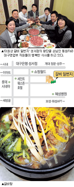 음식문화기업체인 동원F&B 대구영업부 직원들은 이런 고민을 전혀 하지 않는다. 대구영업부 대구유통지점 전현석(37) 지점장은 "우리는 회식 때마다 늘 소갈빗살 파티를 한다"고 자랑한다. 그 비결은? '갈비 일번지' 성서점이 해결사 역할을 한다.
