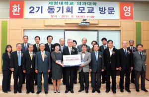 계명대 의과대학 2기 동기회(회장 배언희)는 스승의 날을 하루 앞둔 14일 모교인 계명대를 방문, 계명의대 발전기금으로 1억 원, 태계장학재단 장학기금 1천만원을 전달했다. 이날 행사는 김권배 계명대 의대학장의 환영사, 차순도 동산의료원장의 축사, 배언희 동기회장의 인사에 이어 오희종 준비위원장이 발전기금을 전달했다.
