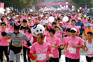 유방건강에 관한 유용한 정보를 제공하고 조기검진의 중요성을 알리기 위한 2011핑크리본 사랑마라톤대구대회가 9일 대구스타디움 서편광장에서 ㈜아모레퍼시픽 주관으로 열려 2천여 명의 참가자들이 도로를 따라 달리고 있다.