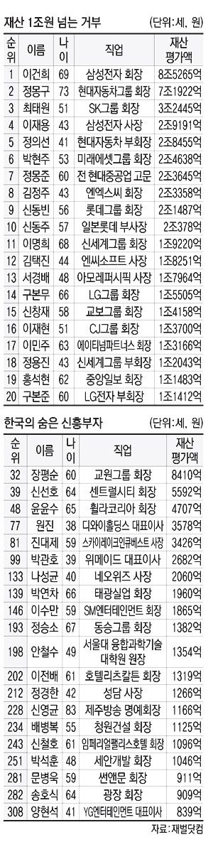 전체 순위 1위인 이건희 삼성전자 회장의 자산은 8조5천265억원이었다. 정몽구 현대자동차그룹 회장이 7조1천922억원으로 2위, 최태원 SK그룹 회장이 3조2천445억원으로 3위를 차지했다. 이재용 삼성전자 사장(2조9천191억원), 정의선 현대차 부회장(2조8천455억원), 정몽준 전 현대중공업 고문(2조3천645억원), 신동빈 롯데그룹 회장(2조1천487억원), 신동주 일본롯데 부사장(2조378억원)도 10위권에 이름을 올렸다.