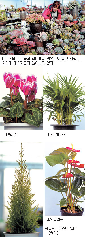 다육식물은 선인장류로 가시가 없고 빨강, 노랑, 주황색 등 팔색조의 색깔을 자랑하며 종류만도 수천 가지에 달한다. 키우기 쉽고 자기 취향에 따라 다양한 색깔을 낼 수 있고 아파트 발코니 등 작은 공간에서도 기를 수 있어 마니아들이 늘고 있다.