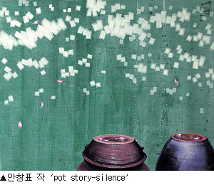 서양화가 안창표 개인전이 12일까지 전주 교동아트센터에서 열린다. 작가는 우리 삶의 정서가 깊게 배어있는 장독을 소재로 세월과 시간의 흐름을 새로운 공간 구성을 통해 짜임새 있게 표현해왔다. 장독이라는 소재가 가지고 있는 민족적이고 토속적인 정서가 화면을 지배하는 가운데 희미한 이미지의 꽃을 등장시켜 어린 시절 고향에 대한 그리움을 불러 일으킨다. 장독의 형태미나 조형적인 가치보다도 장독을 통해 떠올리는 삶의 정서를 되살려내는 일이 주가 된다. 작가는 전통과 현대의 접점에서 작품을 선보인다. 010-2508-6299.