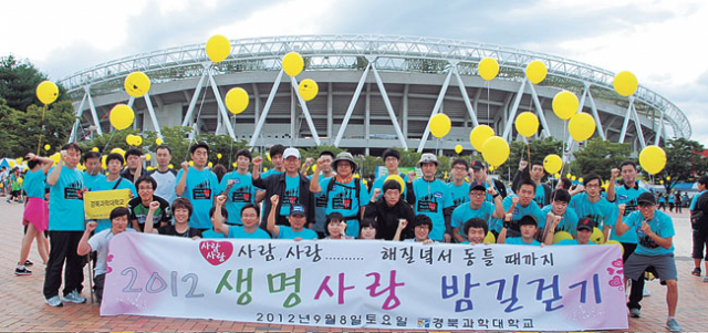 경북과학대(총장 도정기) 교수와 학생 100여 명은 8일 대구스타디움에서 '대구생명의 전화'가 개최한 '2012 생명사랑 밤길걷기'에 참가해 생명의 소중함을 생각하는 시간을 보냈다.