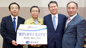 대구은행 경북중부본부 임환오 본부장을 비롯한 임직원들은 9일 불산 2차 피해지역인 산동면 봉산'임천리 주민들에게 성금 3천만원을 전달(사진)했다. LG디스플레이㈜ 구미사업장 임직원들도 성금 3천만원을, 국제라이온스 경북지구 회원들은 대형 TV 1대, 슬리퍼 400개, 칼슘우유 등 1천만원 상당의 물품을 전했다.