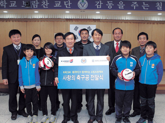대구FC는 16일 칠곡교육지원청을 찾아 Wee버스 소속 청소년들에게 축구공, 대구FC 후드 등 후원물품을 전달했다. 대구FC는 지난해 9~12월 경기 득점당 15만원을 적립하는 방식으로 후원금 420만원(총 28골)을 마련, 각종 후원 활동을 하고 있다.