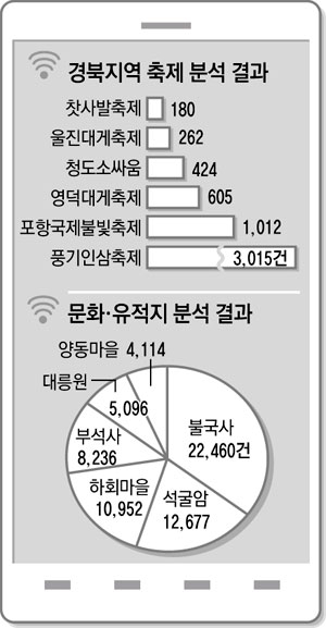 그러나 불교문화유적이 많은 경주는 수학여행 코스라는 전형적인 이미지를 벗어나지 못하고 있고, 유교문화권인 하회마을과 양동마을은 여름방학 기간에만 관심도가 높아지는 점은 문제로 지적됐다. 또 풍기인삼축제나 대게축제의 경우 관심도는 높지만 연예인이나 축하 공연에 관심이 집중돼 축제 대상을 적극적으로 홍보할 필요가 있는 것으로 분석됐다. 이번 분석은 SNS 상의 주제어와 주변언어를 통해 정보를 정량적으로 분석하는 '빅데이터 분석 기법'이 적용됐다. 윤종진 경북도 기획조정실장은 "SNS 분석 자료는 현장의 살아 있는 목소리라는 점에서 의미가 있다"며 "관련 분야의 정책 수립을 위한 참고자료로 활용할 수 있도록 빅데이터 분석기술을 다양한 분야로 확대 적용할 것"이라고 말했다.