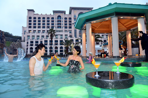 롯데호텔 제주가 100억원을 들여 완공한 프리미엄 야외 스파 & 가든 '해온'(海溫)이 최근 문을 열었다. 제주 서귀포시 롯데호텔 온수풀장에서 관광객들이 칵테일과 음료 등을 마시며 물놀이를 즐기고 있다. 정운철기자 woon@msnet.co.kr