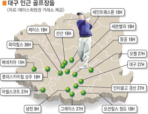 2012년 말 기준 국내 골프장은 466개에 달하며, 경북지역에서는 운영 중인 골프장이 40개소(회원제18곳, 대중제 21곳, 간이 1곳)에 이른다. 이 가운데 절반 이상은 10년 이내 지어진 신설골프장이다.