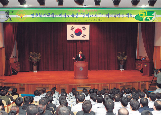 대구경찰청은 8일 대강당에서 전 직원이 참석한 가운데 '뛰어라 지금이 마지막인 것처럼'이란 주제로 양준혁 야구재단 이사장의 특강을 열었다.