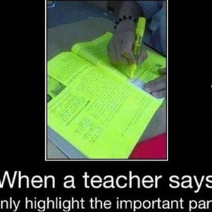 공개됀 교과서 형광펜 사용법 사진에는 "선생님은 중요한 부분만 형광펜을 칠하라고 말씀하셨다"라는 설명이 사진 아래 적혀 있지만 실상 사진 속에는 교과서 전체를 형광펜으로 칠하는 학생의 모습이 보여 폭소케 만들었다.