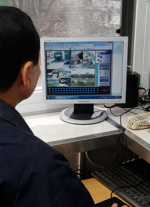 학교폭력 등을 감시하기 위해 교내에 설치된 CCTV에 대부분 50만 화소 이하의 저화질 카메라가 설치돼 보다 선명한 고화질 장비로 바꿔야 한다는 지적이 일고 있다. 18일 대구시내 한 중학교 직원이 교내에 설치된 CCTV 화면을 살펴보고 있다. 김태형기자 thkim21@msnet.co.kr