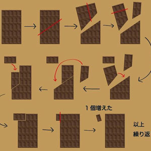 '초콜릿 밑장 빼기' 게시물은 신기하게도 5×5의 25칸 초콜릿을 그림에 설명된 대로 잘라서 다시 맞추면 초콜릿 조각 하나가 늘어나 눈길을 끌었다.