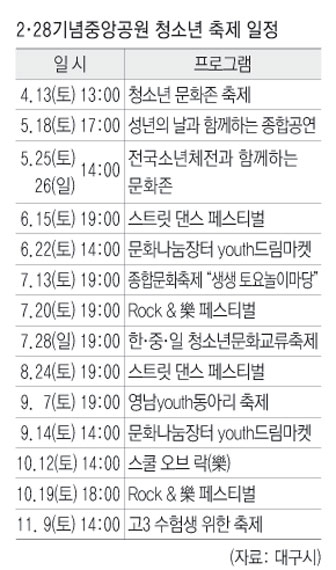 '청소년 문화존 축제'가 이달 13일부터 11월 말까지 매주 토요일 모두 15회에 걸쳐 중구 2'28기념중앙공원 등에서 다양하게 펼쳐진다.