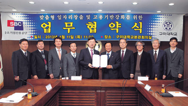 구미대학교(총장 정창주)와 중소기업진흥공단 중부권본부(본부장 유종진)는 11일 일자리 창출 및 고용기반 강화를 위한 양해각서를 체결하고 인턴십 프로그램 운영을 통한 취업 연계, 대학생 현장실습 알선, 청년 창업 촉진 등 협력을 약속했다.