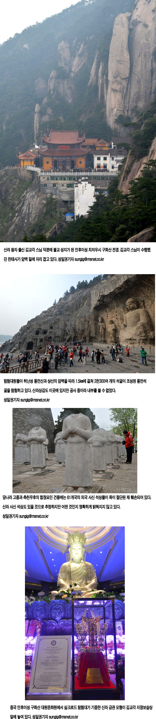 안후이성 치저우시 구화산의 아침은 안개로 덮여 있었다. 케이블카에서 내려 정상 부근에서 바라본 구화산은 운무를 감싸 안아 마치 무릉도원 같았다. 신라 왕자 출신이었던 김교각(696~794) 스님도 속세를 떠나 이곳 구화산에서 구도한 뒤 출가했다. 이후 김교각 스님은 화성사(化城寺)를 짓고 불법을 설교하다가 99세의 나이에 참선 중 입적했는데 육신이 3년 동안 썩지 않자 제자들이 금물을 입혀 등신불(等身佛)로 봉헌해 육신보전에 봉안했다. 탐험대가 찾은 지난달 29일에도 많은 불자들이 이곳을 찾아 법당 앞에서 향을 피우며 제를 올리고 있었다. 김교각 스님은 국내에는 잘 알려지지 않았지만, 중국에서는 지장보살왕으로 알려진 유명 인물이다. 김교각 스님은 중국에서 최고의 수도승 지위에 올랐고 생전 교화활동이 지장보살과 흡사하여 지장보살의 화신으로 인식되었고 스님의 활동으로 구화산을 중국 불교 4대 명산과 불교 성지로 만든 인물이다.