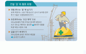 건설 '갑'들은 지속적으로 공사를 따내지 못하면 기업을 유지할 수 없는 건설수주업의 특성상 구조적으로 우월적 지위를 갖게 되는 점을 이용해 하도급 계약 위반, 대물 변제, 해외 연수 비용, 과태료 대납 등으로 하도급 업체들을 쥐어짜고 있다.