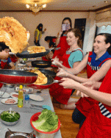 "김치전 공중제비돌기 재밌어요." 대구지역 원어민교사와 유학생 등 외국인들이 8일 오후 대명동 풍성손메밀묵집에서 대구 앞산 맛둘레길 상가번영회와 남구 도시만들기 지원센터가 주최한 '한국음식 문화체험' 프로그램에 참가해 김치전을 만들고 있다. 정운철기자 woon@msnet.co.kr