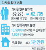 성서5차산단에 기업들이 몰리면서 주변에 큰 변화를 불러왔다. 성서5차산단이 위치한 다사읍 인구는 최근 2년간 크게 증가했다. 올 4월 말 기준 현재 다사읍 인구는 6만2천705명으로 최근 4개월 새 516명이 늘었다. 지난해 말 인구는 전년도(2011년)보다 4천541명이나 늘어난 6만2천189명을 기록하는 등 다사읍이 성서5차산단 효과를 톡톡히 보고 있다.(그래프 참조)