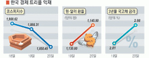 채권시장에도 충격파가 미쳤다. 20일 오후 국내 채권시장에서 국고채 3년물 금리는 전 거래일보다 0.17%p 오른 연 2.98%를 기록했다. 올 들어 최대 상승폭이다. 5년물 금리와 10년물 금리도 전날보다 각각 0.17%p, 0.18%p 상승한 연 3.19%, 연 3.42%를 나타냈다.