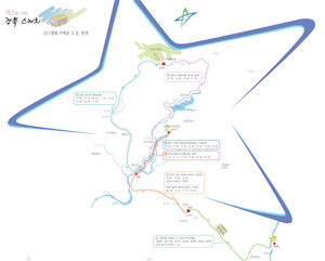 별빛마을 입구로 돌아와 오후 3시에 자양면을 거쳐 영천시내로 가는 버스에 올랐다. 영천댐 상류에는 물안경을 끼고 다슬기를 잡는 주민들이 보인다. 강변에는 캠핑족들이 친 텐트가 알록달록한 퀼트를 짜둔 듯 했다. 영천댐 도로를 시작으로 충효삼거리~도일리~보현리~노항리~삼귀리 등을 잇는 33km 구간은 국내 최대의 벚나무 터널이다.