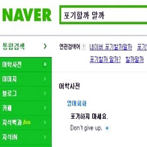 네이버에 '포기할까 말까'라고 검색하면, "포기하지 마세요(Don't give up)"라는 어학사전 결과가 나온다.