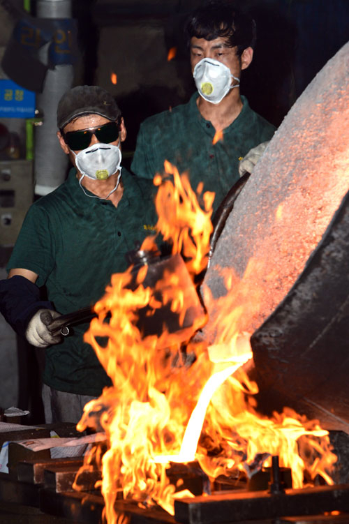'이열치열(以熱治熱) 주물공장의 여름나기.' 여름을 잊은 산업전사들이 살갗을 태울 듯한 기세로 펄펄 끓는 용광로 주변에서 뜨거운 쇳물과 씨름하고 있다. 25일 고령군 다산면 다산지방산업단지 내 한 주물공장에서 직원들이 1천500℃가 넘는 쇳물을 제품 틀에 붓는 작업을 하고 있다. 이 공장 관계자는 "작업장 평균온도가 50℃로 폭염이란 말은 남의 얘기처럼 들린다"고 말했다. 정운철기자 woon@msnet.co.kr