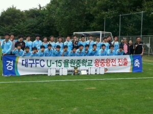 율원중은 지난달 28일 대구강변구장에서 열린 전국 중등 축구리그 대구 예선 최종라운드에서 대구DSCA FC(U-15)를 30대0으로 대파했다. 이로써 율원중은 대구 예선서 15승2무4패(승점 47)를 기록, 대륜중(승점 52)에 이어 2위를 차지하며 전국에서 64개 팀이 겨루는 왕중왕전에 진출했다.