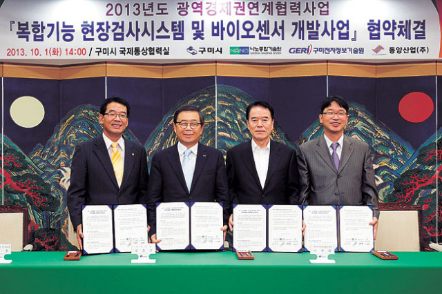 구미시와 나노종합기술원, 구미전자정보기술원, 동양산업㈜은 1일 산업통상자원부 광역경제권 연계 협력사업 신규사업으로 선정된 복합기능 현장검사 시스템 및 바이오센터 개발사업의 전자의료기기산업 분야에 연구개발(R&D) 비용 16억원을 지원하기로 업무협약을 체결했다.