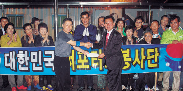 대한민국 서포터스 봉사단과 구미라이온스클럽(회장 최병식)은 13일 대구도시철도 대구역 광장에서 하담봉사단(단장 남세현)에 양말 500켤레와 200만원 상당의 비상약품을 전달하고 노숙인들에게 무료급식 봉사활동을 했다.
