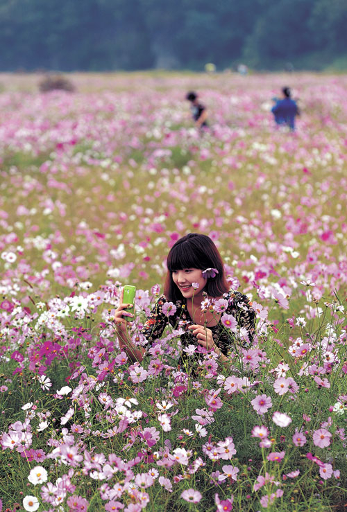 '20대의 가을 산책'. 초가을 날씨를 보인 13일 휴일을 맞아 대구 북구 금호강 노곡 하중도를 찾은 여성들이 활짝 핀 코스모스 앞에서 아름다운 가을 정취를 휴대폰에 담고 있다. 김태형기자 thkim21@msnet.co.kr