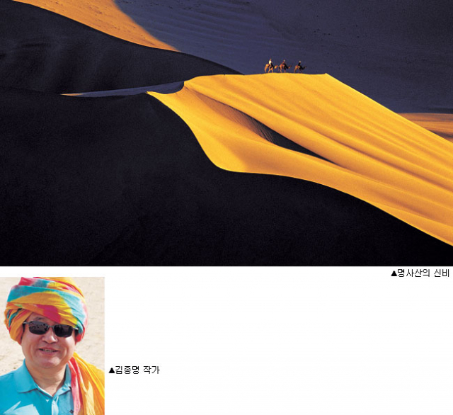 중국 돈황은 막고굴 벽화와 더불어 명사산(鳴沙山)으로 유명하다. 명사산은 말 그대로 바람이 불면 '우~'하는 소리가 난다 하여 붙여진 이름. 사막의 거센 바람이 거대한 모래언덕과 산을 만들었다. 선명한 선과 색의 대비가 신비스럽다. 마치 낙타를 탄 동방박사가 우주의 낯선 행성을 여행하는 듯하다. 행글라이더를 타고 하늘에서 내려다 본 사막의 모습이다.