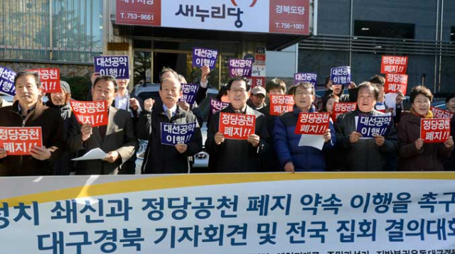 지방분권운동 대구경북본부와 대구시의정회, 참여연대 등 대구시내 7개 시민사회단체 활동가들이 12일 새누리당 대구시당 앞에서 기초지방선거 정당 공천 폐지를 촉구하는 집회를 열고 있다. 이들은 정당공천폐지가 대선공약인 만큼 새누리당은 책임 있는 집권여당으로서 정당 공천 폐지를 당론으로 채택하라고 요구했다.