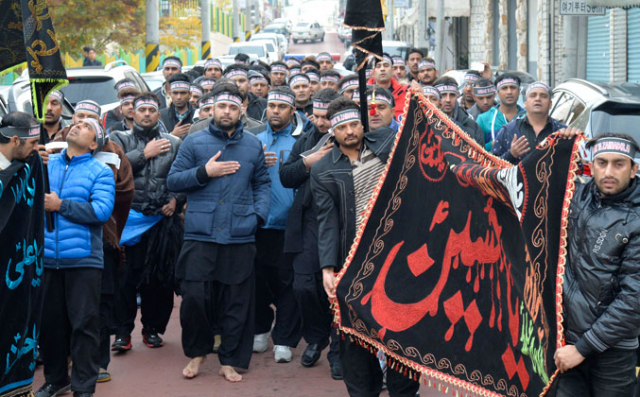 14일 오전 대구 달서구 죽전동에서 대구에 거주하는 외국인 이슬람교신자 70여 명이 이슬람교 행사인 무하람(Muharram)을 맞아 한 손으로 가슴을 치며 행진하고 있다. 무하람은 이슬람교 예언자 무함마드의 외손자인 이맘 후사인이 순교한 것을 기념하기 위한 추모 행사이다.