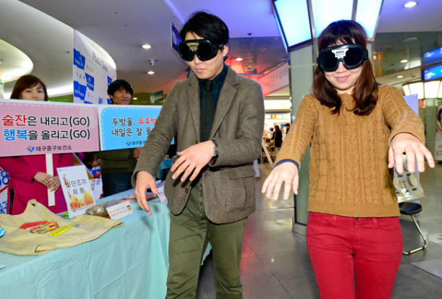 술자리가 많은 연말연시를 앞두고 26일 대구 중구보건소가 대현프리몰 지하상가에서 마련한 '절주 홍보행사'에서 시민들이 음주(소주 4, 5잔) 효과를 내는 고글을 쓴 채 음주 시 느끼는 보행장애 체험을 해보고 있다. 최근 경찰청은 연말연시를 맞아 유흥가, 찜질방, 식당가 주변에서는 시간대 구분없이 상시로 음주운전 단속을 실시한다고 밝혔다. 우태욱기자 woo@msnet.co.kr