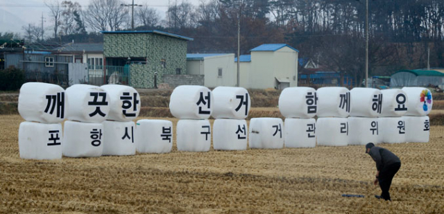 내년 6월 4일 실시되는 전국지방동시선거를 앞두고 포항시 북구선거관리위원회가 청하면 들녘에 볏짚을 싼 곤포 사일리지를 이용해 공명선거캠페인에 나서 눈길을 끌고 있다.