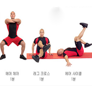 허벅지 안쪽 지방 연소에 도움되는 에어 체어와 레그 크로스, 허벅지부터 종아리까지 하체를 전반적으로 매끈하게 다듬어 주는 에어 사이클 총 세가지 운동으로 구성되어 있다.