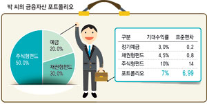 먼저 기대수익률을 정해야 한다. 기대수익률은 자신의 자산현황이나 투자성향, 재무목표 달성 여부 등을 고려하여 정해야 한다. 박 씨의 경우 재무목표 등에 따른 시뮬레이션 결과 적어도 7%의 수익을 올려야 한다는 결론이 났다. 그다음은 7%의 수익률을 올리기 위해 정기예금, 채권, 주식형펀드 등의 금융상품을 어떻게 배분할 것인지를 정하면 된다.