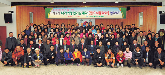 고령군 농업기술센터는 최근 발효식품학과 신입생 119명이 참석한 가운데 제7기 대가야농업기술대학 입학식을 열었다. 신입생들은 10월까지 식품발효의 이론과 실습, 농업환경 및 재배 분야, 경영관리 및 6차산업 분야, 인문'문화'교양분야, 선진기술을 배운다.