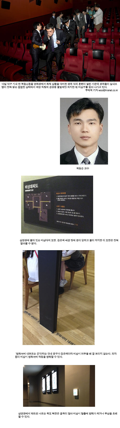 곽 교수는 "밖을 볼 수 없는, 유리창이 없는 영화관은 화재로 정전이 되면 암흑천지가 된다. 이때 복도에 쌓인 적치물은 탈출을 가로막는 마수(魔手)이다. 이를 대비해 평소 비상로 확보 및 관리와 함께 야광스티커 부착, 점등식 피난유도선 설치가 필요하다"고 했다.