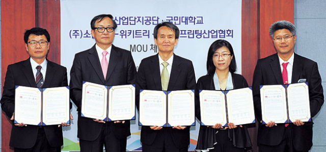 한국산업단지공단 대경지역본부(본부장 박찬득)와 3D프린팅산업협회(대표 국연호), 국민대학교 산학협력단(단장 이채성), ㈜소셜뉴스 위키트리(대표 공훈의), ㈜엠포털(대표 장윤희)은 8일 국민대 산학협력단에서 창조산업 클러스터 조성에 관한 업무협약을 체결하고 교류활동 증진을 약속했다.