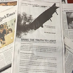 미국 교민들이 뉴욕타임즈에 세월호 참사와 관련해 박근혜 정부를 비판하는 광고를 게재됐다.