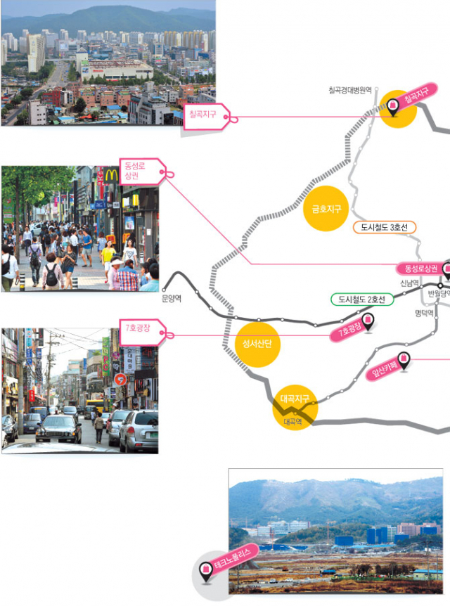 대구 상권이 격변기를 맞고 있다. 신서혁신도시, 금호신도시, 대구테크노폴리스 등 대형 택지개발지구가 조성되고 도시철도 3호선, 4차순환도로 개통 등 교통 인프라 구축으로 상권이 크게 변모할 전망이다. 특히 동성로 등 대표적 도심 상권은 다양한 개발 호재와 지자체 지원으로 상권이 강화되는가 하면 개성 만점 상권으로 재탄생하고 있다.