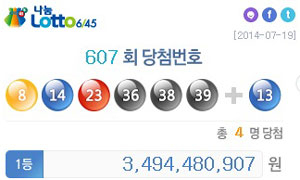 나눔로또는 19일 추첨된 로또복권 제607회 1등 당첨번호가 '8·14·23·36·38 39'번이 뽑혔다고 밝혔다.