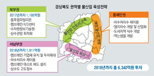 경북도는 수(水) 환경과 수생태계를 충분히 활용, 특화된 물산업이 지역실정에 맞게 효율적으로 키워질 수 있도록 경북을 3개 권역(북부권, 서남부권, 동해안권)으로 구분, 물산업 육성책을 추진 중(그래픽)이다. 2018년까지 모두 6천340억원이 투입된다.