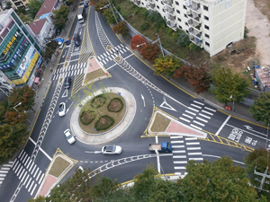 동구청은 2억2천만원을 들여 3개월 동안 회전교차로를 만들면서 교차로 진입 직전 도로 30여m를 편도 2차로에서 1차로로 좁히고, 직선에서 곡선으로 바꿨다. 그러자 차들의 속도가 눈에 띄게 줄었고, 횡단보도를 지나는 보행자도 안전해졌다.