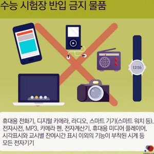 수능 반입금지 물품으로는 휴대용 전화기를 비롯해 스마트 기기(스마트 워치 등)·디지털 카메라·MP3·전자사전·카메라펜·전자계산기·라디오·휴대용 미디어플레이어·시각 표시와 교시별 잔여시간 표시 이외의 기능이 부착된 시계 등 모든 전자기기의 시험장 반입이 금지되는 것으로 밝혀졌다.