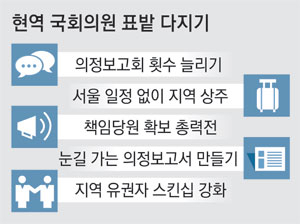 지역구 관리를 위해 지역에서 살다시피 하는 의원들이 눈에 띄게 늘었다. 홍지만 의원(달서갑)은 이달부터 대구에서 지내며 대부분의 시간을 지역구 챙기기에 쏟고 있다. 홍 의원은 요즘 새벽부터 밤까지 지역 산악회와 관변단체 등의 행사에 참석, 주민들과 스킨십을 강화하고 있다. 홍 의원은 "앞으로 한 달간은 지역구에 머물 계획이다. 이후에도 국회 활동 말고는 서울에서 약속을 가능한 한 잡지 않고 지역구에 계속 머무르겠다"고 밝혔다.
