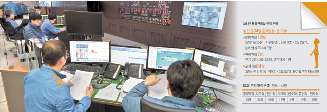 모두 34명(관제팀장 1명 포함)이 근무하는 통합관제실은 운영관제(12명)와 전력관제(7명), 고객관제(14명)가 각각 3조 2교대 형태로 운영한다.